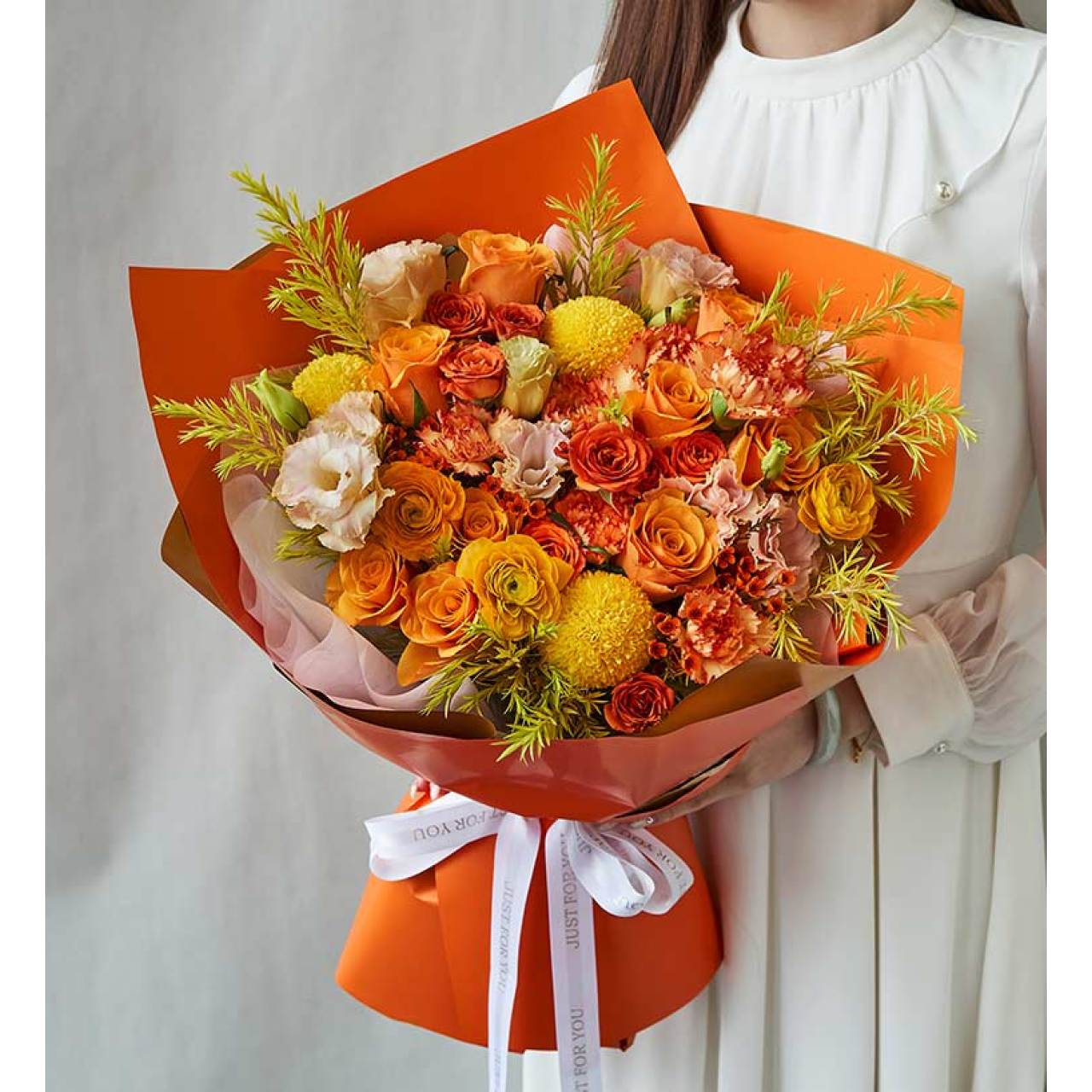 辉煌玫瑰9枝,黄色乒乓菊3枝,黄色洋牡丹3枝,黄色橙边康乃馨5枝,橙色腊梅2枝,橙色多头泡泡2枝(3头以上/枝),香槟色洋桔梗3枝(3头以上/枝),黄色千层金8枝