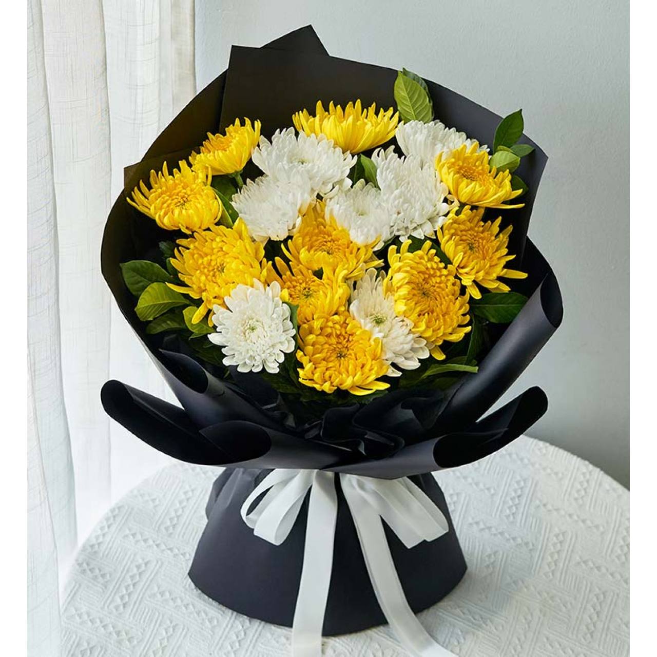 白色菊花7枝,黄色菊花10枝,栀子叶若干