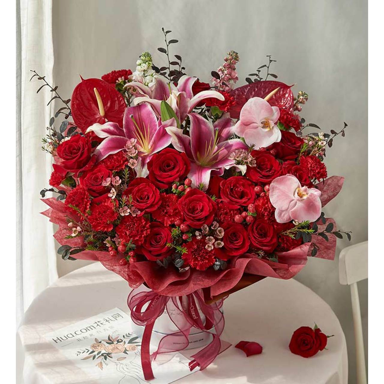 红玫瑰13枝,红色康乃馨19枝,粉色百合1枝(4头/枝),白色紫罗兰4枝,喷阿玛尼红,红掌2枝,腊梅7枝(缺货可用红色多头玫瑰等类似花材替换),红豆6枝,红继木15枝,白色蝴蝶兰2枝喷阿玛尼红