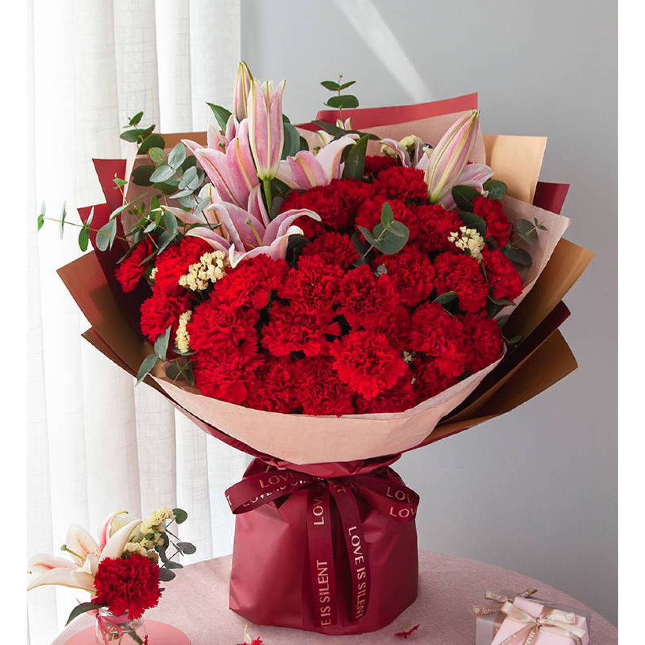 红色康乃馨29枝、粉色百合3枝(3-5头/支)、黄色勿忘我3枝(缺货可用类似黄色或粉色配花代替)、尤加利10枝