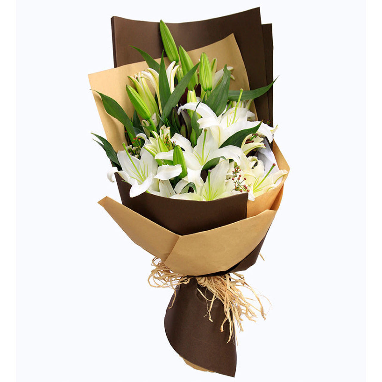 白色多头香水百合6枝(3-5头/支),澳州腊梅做点缀(腊梅为季节性花材,缺货用相思梅代替)