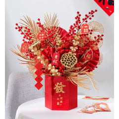金色仿真5叉尤加利叶1枝,金色干莲蓬3个,金色仿真3叉散尾葵2枝,金色仿真银杏叶2枝,仿真红色9叉冬青6枝,节日挂卡7个,红色折扇3个。备注:春节挂卡、花筒由于城市不同,形状和文字可能有所差异,但将确保是春节新年图案,具体以当地出货为准。
