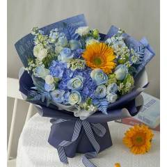 浅蓝色绣球1枝,绿心向日葵1枝,骄傲白玫瑰8枝(喷淡蓝色),白色洋桔梗5枝(3头以上/支),绿色洋桔梗3枝(3头以上/支),白色紫罗兰4枝(喷淡蓝色),白飞香(新娘蕾丝花4枝,白色蓝星花2枝,高山羊齿4枝喷蓝色