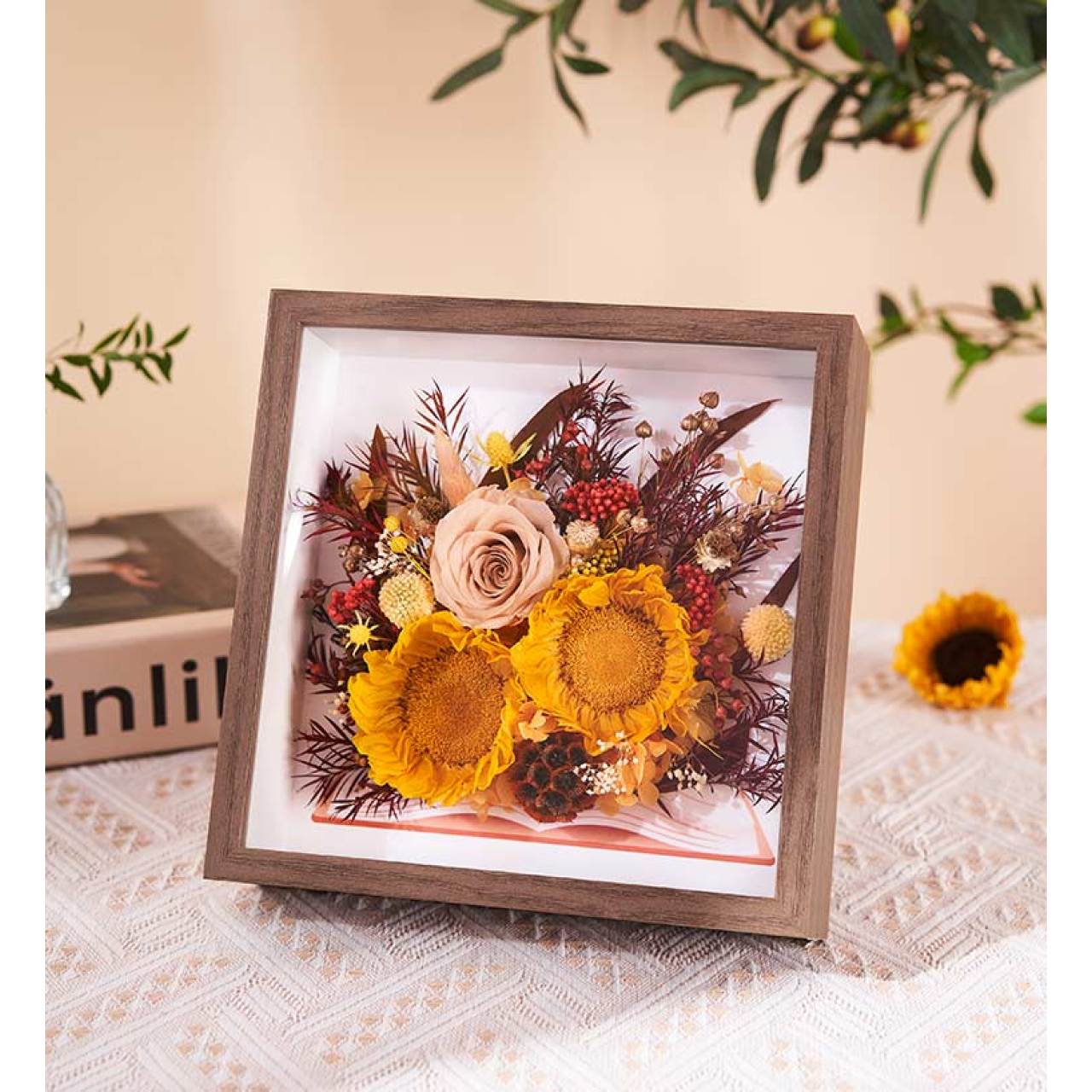 花材:黄心向日葵2朵(5-6)、永生花玫瑰浅咖5-6、橘色绣球、黄色米花、白色满天星、白色米花、米色黄金球、米色兔尾草、红色米花、香槟色米花、橙红色复古松虫果子、金色尤加利果、金色小松果、秋色叶子、吸色橙尤加利叶和果子、相思豆金色、香槟色八角花、小蜡菊鲁丹鸟白色喷金、小米果红色、千层金红色、情人果黄色