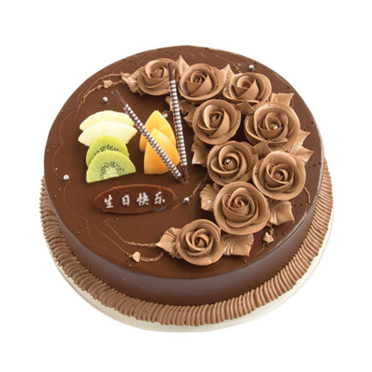 2磅(8寸)圆形巧克力蛋糕:巧克力色玫瑰花装饰,时令水果及巧克力棒点缀,水果+奶油夹层,另有巧克力牌“生日快乐”字样