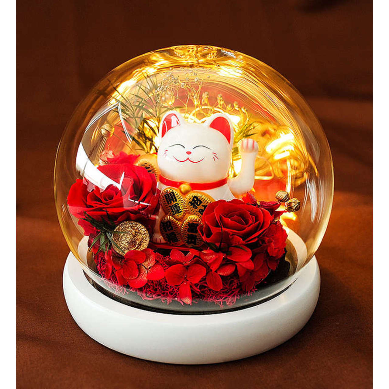首页> 永生花> 永生花分类> 特色永生花> 招财猫永生花水晶球玻璃罩小夜灯