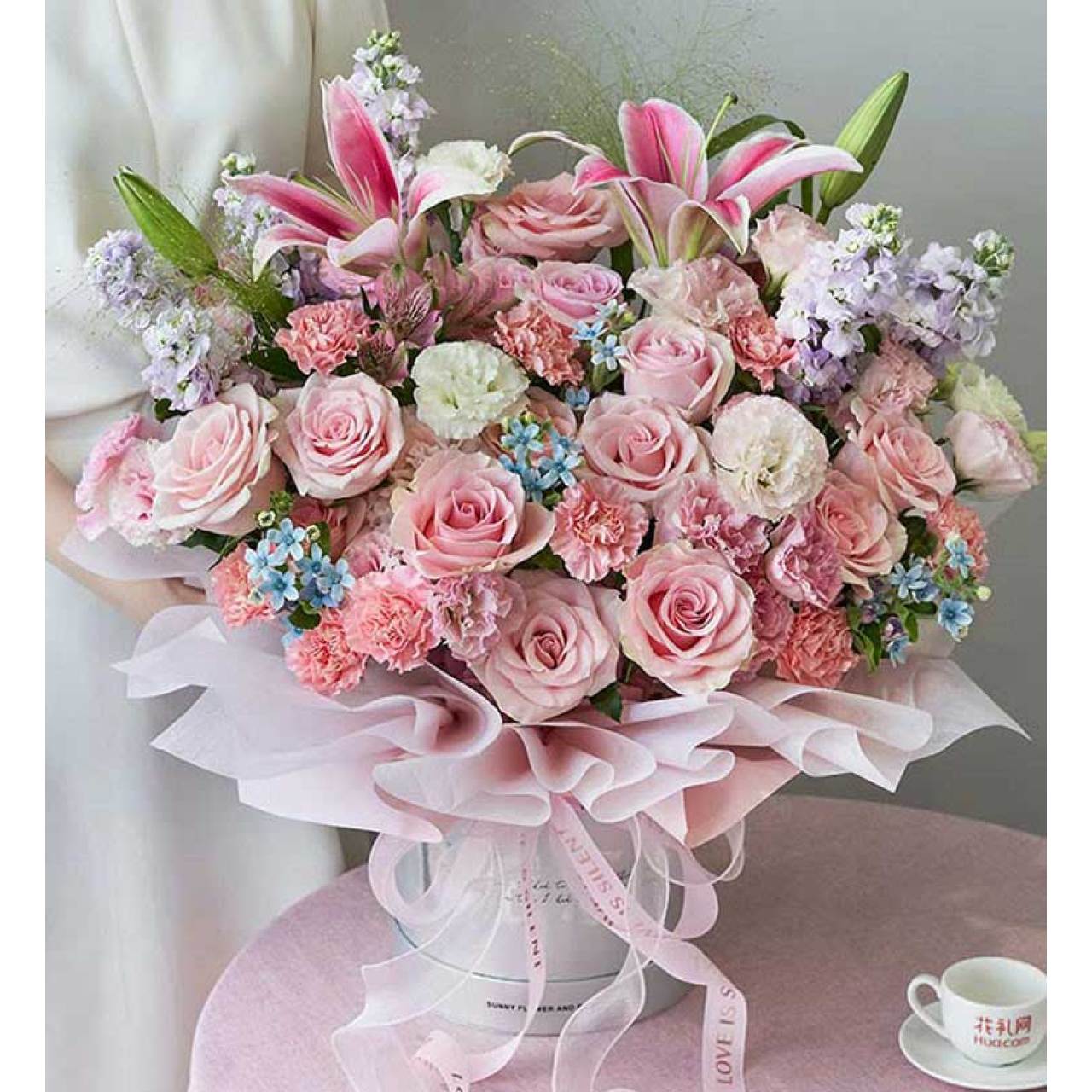 粉色百合2枝(3-5头/支),粉玫瑰15枝(粉爱神、粉雪山、洛神都可),阳光粉桔梗多头8枝(3头以上/支),蓝星花4枝,粉色康乃馨8枝,紫色紫罗兰6枝,喷泉草2枝,粉六出1枝