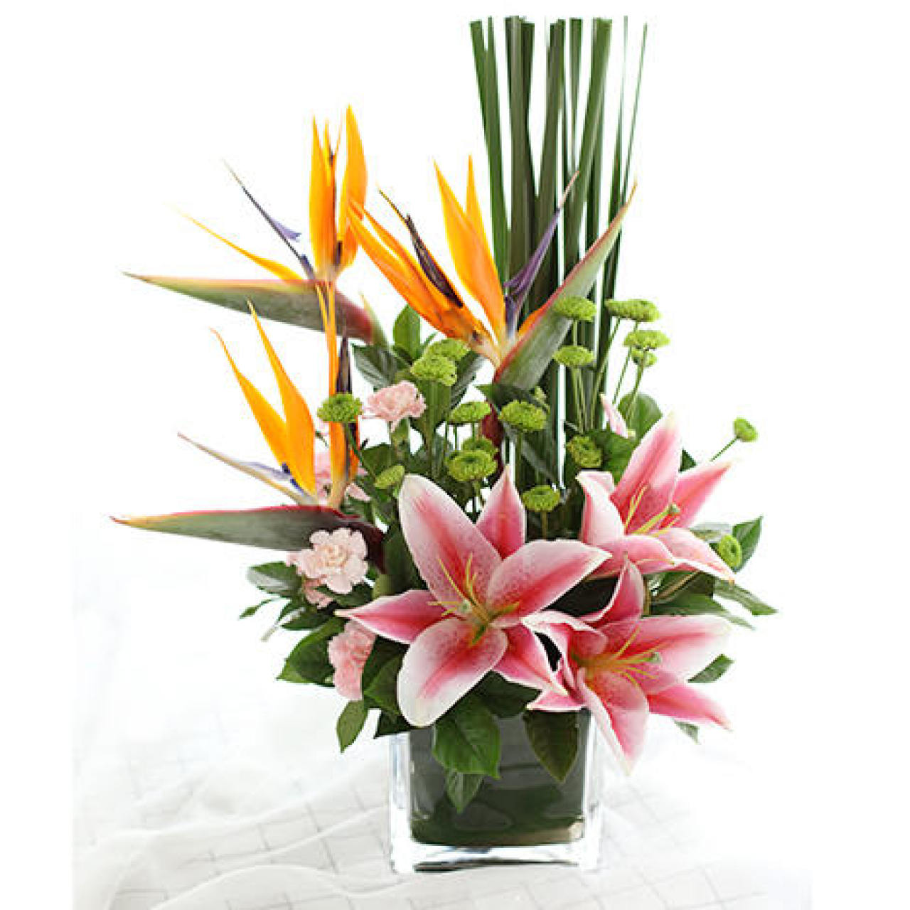 天堂鸟3枝、水竹叶0.3扎、百合1枝、粉色多头康乃馨3枝、小绿菊3枝、栀子叶0.5扎