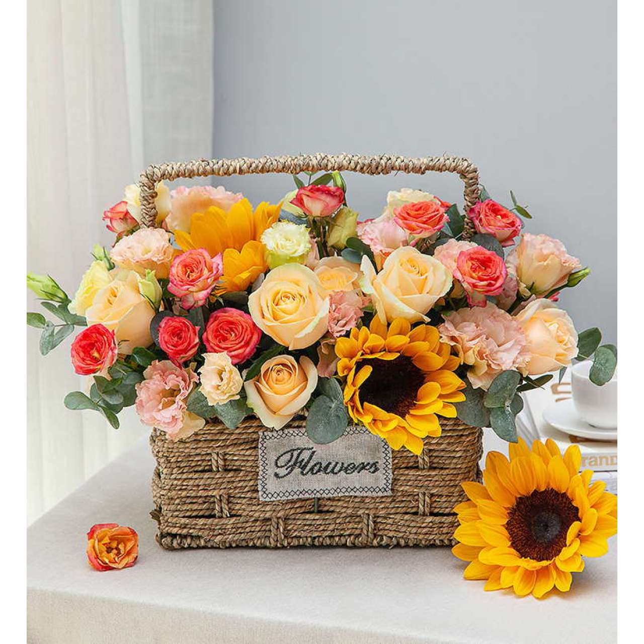 香槟玫瑰11枝、向日葵2枝、香槟色洋桔梗3枝(3头以上/支)、橙色多头玫瑰2枝(6-8头/支)、尤加利叶5枝