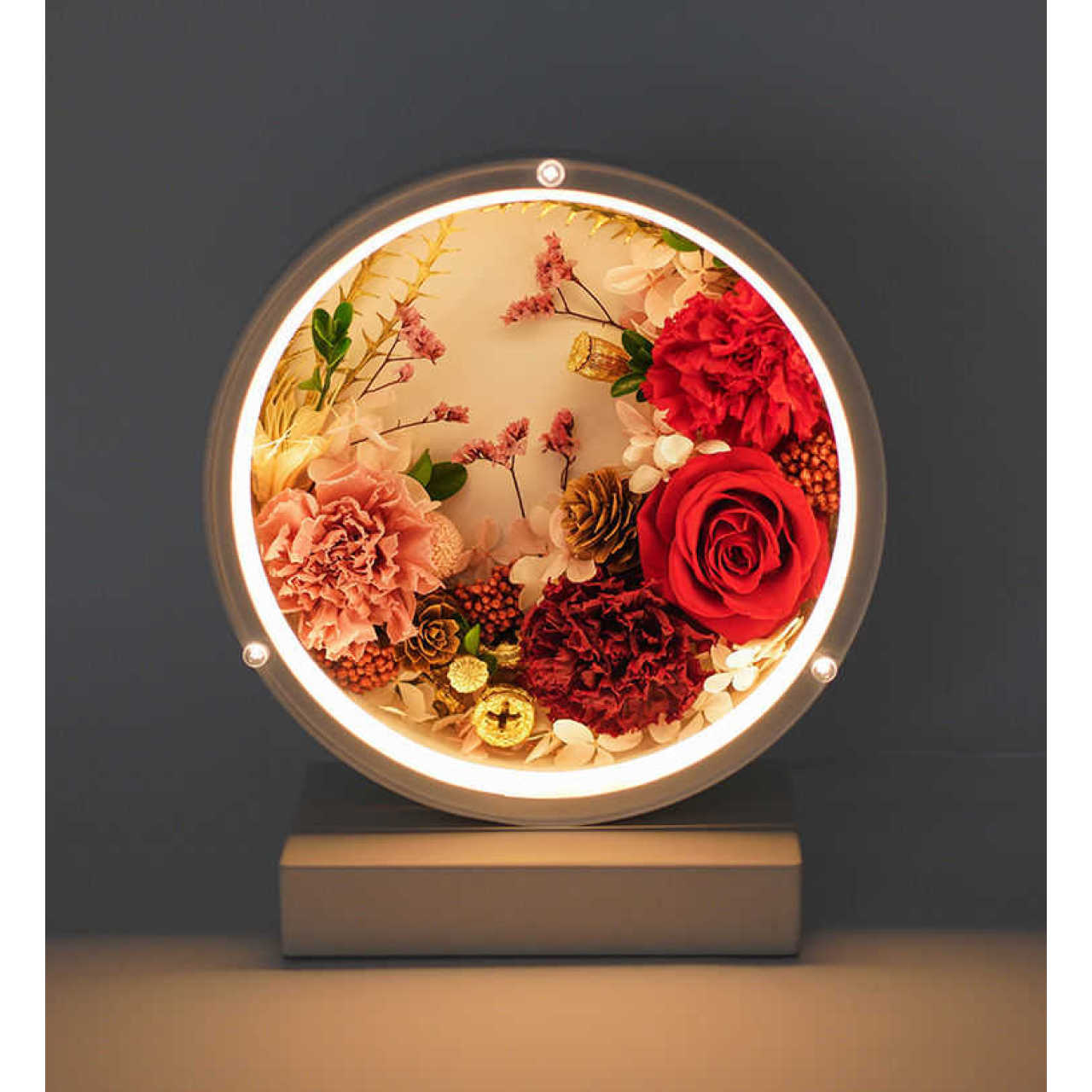 花材:进口多色永生康乃馨、永生花玫瑰、双色永生绣球、尤加利果、松果、八角花、虞美人、情人草、小叶黄杨、羊齿叶、红色米花