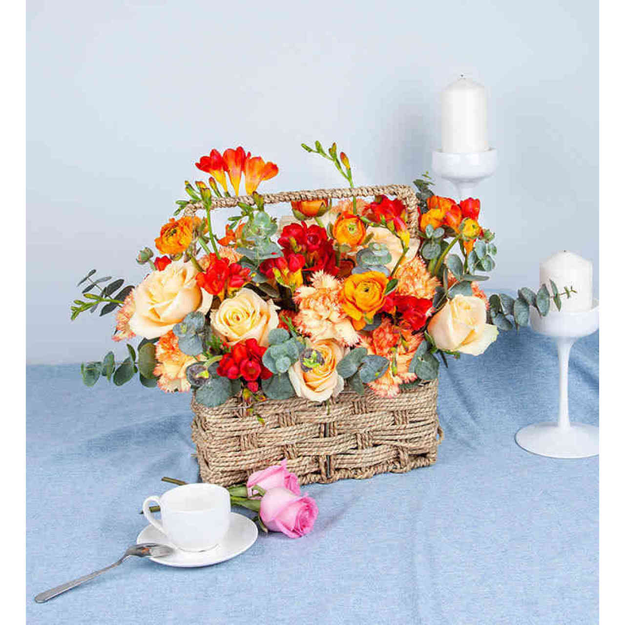 香槟玫瑰10枝,橙康乃馨10枝,红香雪兰10枝,橙色洋牡丹10枝,尤加利叶10枝