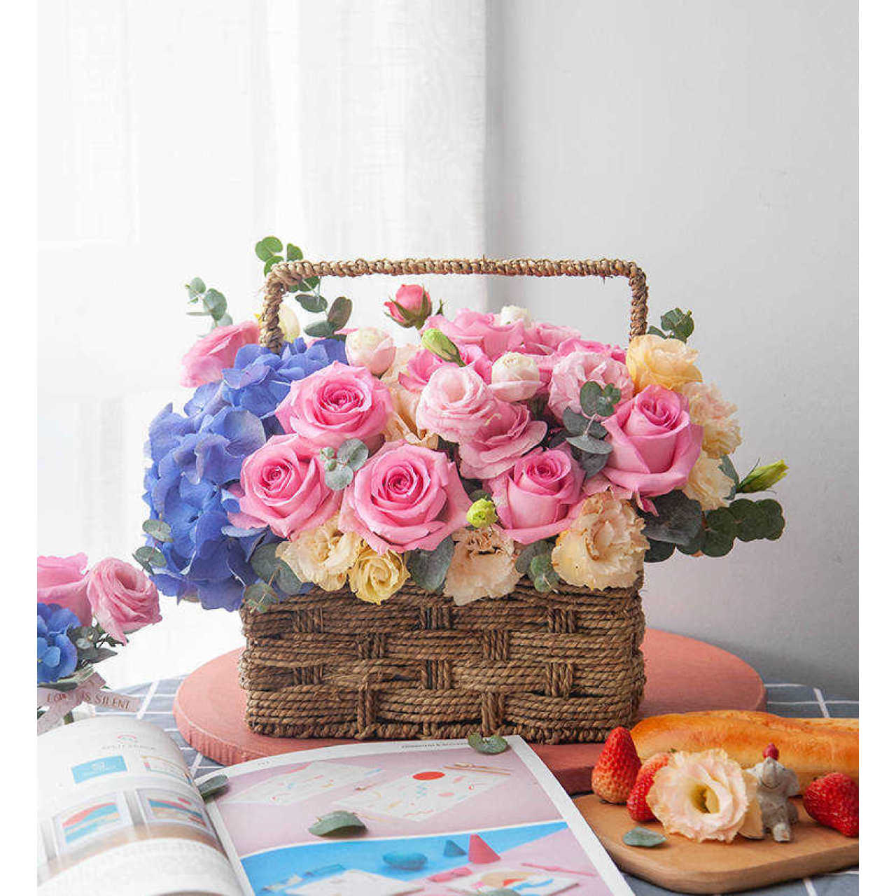 韩式系列花篮精选:苏醒玫瑰13枝,蓝紫色绣球1枝,香槟洋桔梗5枝,粉洋桔梗3枝,尤加利叶5枝